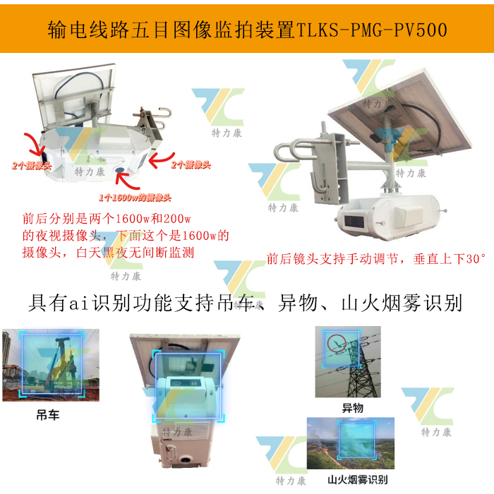 我司研發(fā)的TLKS-PMG-PV500,是一款專為輸電線路設(shè)計的五目圖像監(jiān)拍裝置。在電力系統(tǒng)中,輸電線路常面臨外部因素導(dǎo)致的潛在威脅,如施工車輛誤觸、塔基損壞等。傳統(tǒng)監(jiān)拍裝置視野受限,難以全面監(jiān)控。TLKS-PMG-PV500通過前后各配置兩個攝像機(jī)及下方一個攝像機(jī),實現(xiàn)了360°無死角監(jiān)控,有效解決了這一問題。