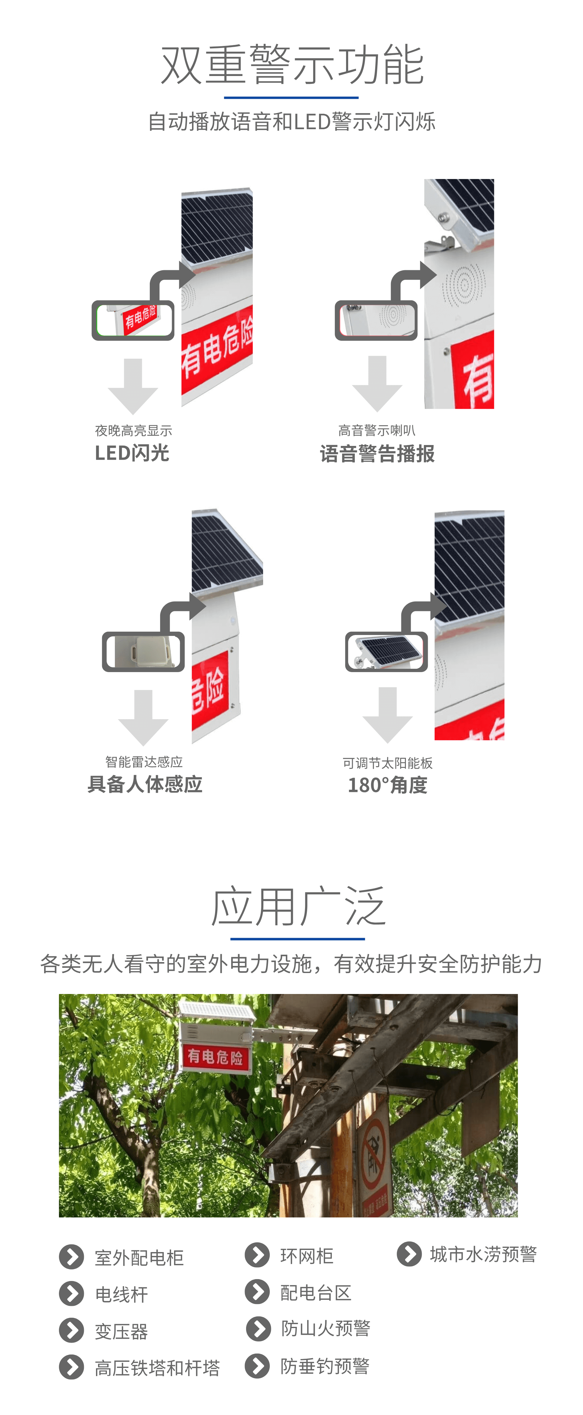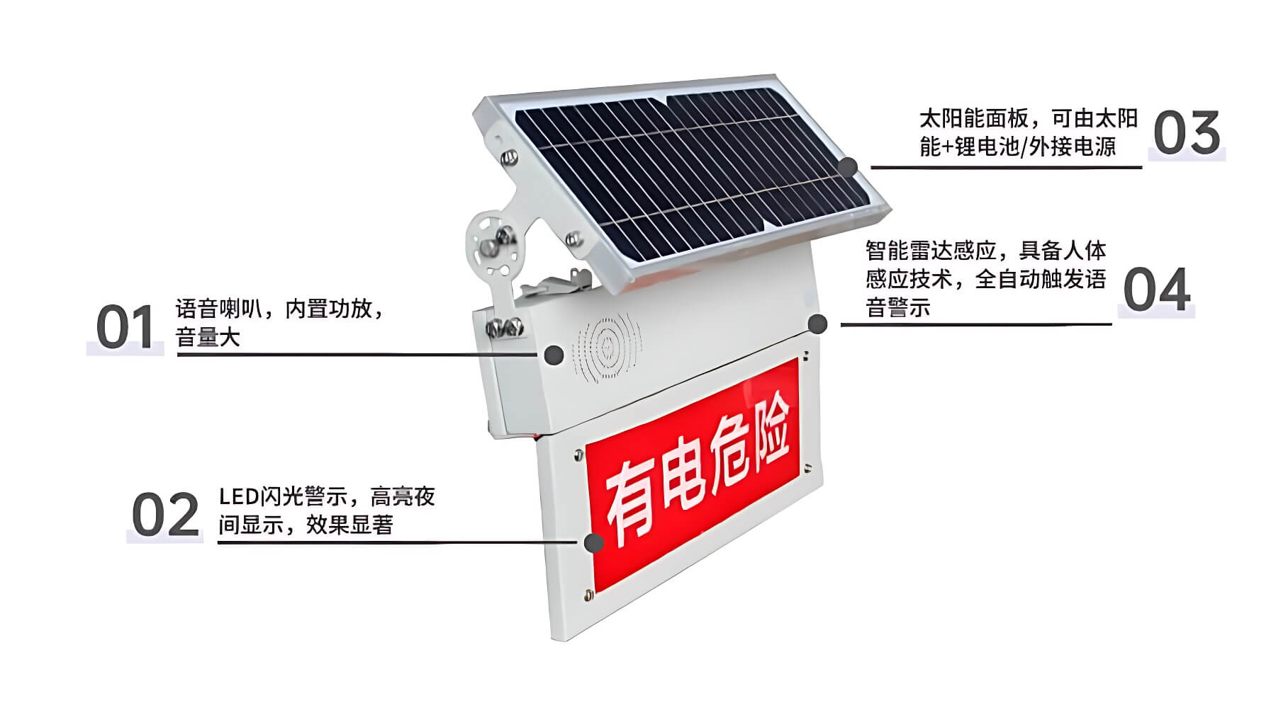 隨著人們對電力的依賴性越來越強,電力設施越來越多,被誤撞帶來危險的次數也不斷增加。目前,現有的室外供電設備如變壓器、電線桿、配電柜等都是無人看守的,為防止閑雜人員觸電,一般都是采用加裝護欄、圍欄等隔離措施,或常掛一塊“高壓危險,行人止步”的標識牌,這種標識牌日久天長極易失落,夜間又不易被發現,因而起不到良好的警示作用,且對一些兒童或不懂電的人員往往起不到安全防護作用。