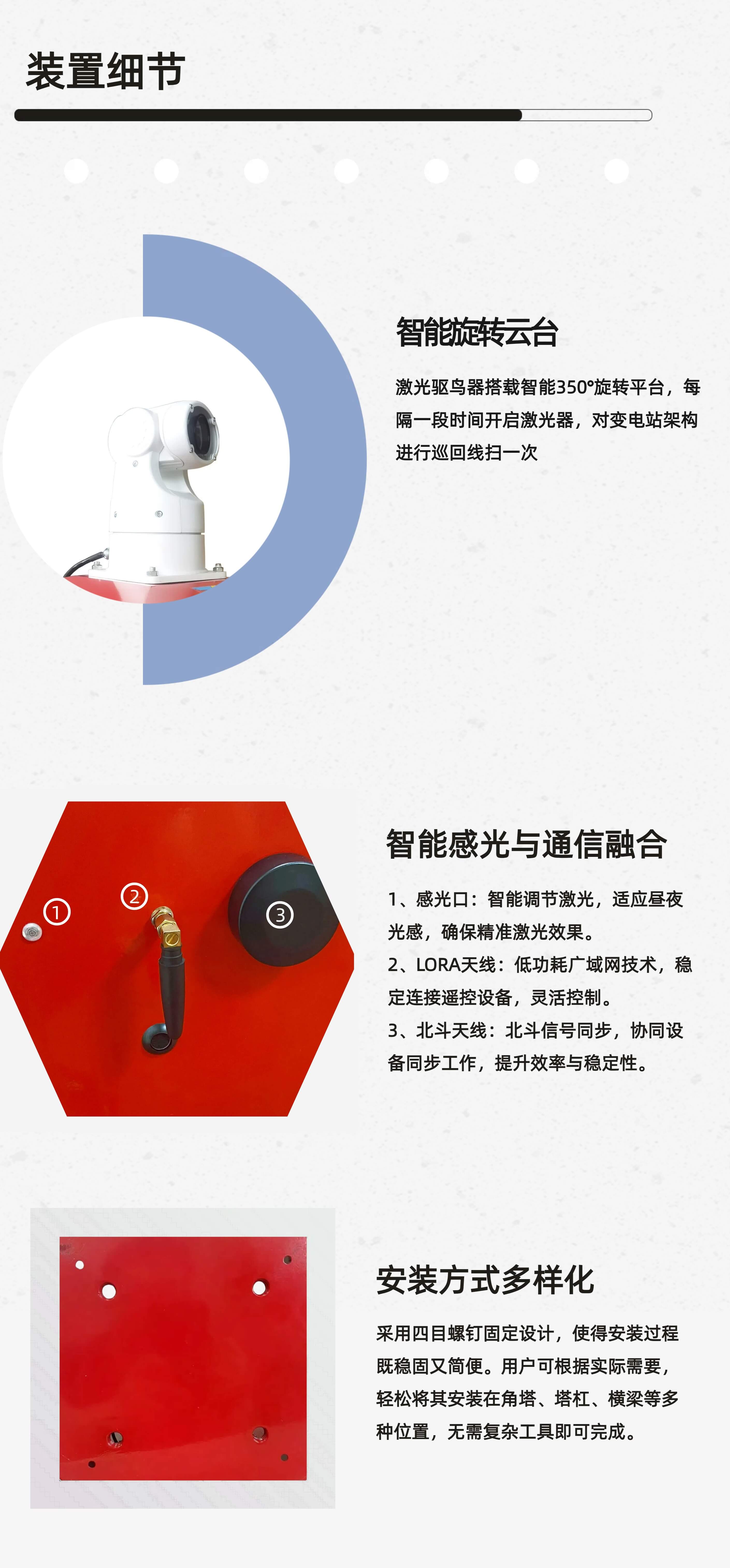 激光驅鳥器主要由一字線激光器和智能云臺兩個重要部件組成。一字線激光器射出一字線的激光,同市面上大多數點狀式激光有所不同,一字線對驅趕變電站架構上的鳥類更為方便;激光器裝載在智能云臺上,通過云臺的轉動進行掃描。整機具備欠壓過壓保護、遙控器遠程遙控、定時功能、分時控保護激光器的功能,安裝使用簡單方便。