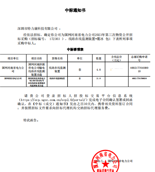 特力康中標國網黑龍江送變電工程公司的2024年度第18次物資類競爭性談判采購項目——慶陽驅鳥器物資框 特力康中標國網甘肅省電力公司省管產業單位2024年第五次物資競爭性談判授權采購項目 中標喜訊:深圳市特力康科技有限公司成功入圍許繼集團綜合能源公司輸電線路視頻在線監測裝置模塊集采項目 中標喜訊:特力康成功中標國網重慶市電力公司渝中一片區項目 特力康成功中標國網天津市電力公司2024年第二次?物?資招標項目 特力康中標國網安徽省電力有限公司蕪湖供電公司2024年3月非物質采購項目 山東電網 “穩塔哨兵”:特力康智能桿塔傾斜監測預警裝置筑牢電力桿塔安全防線 特力康科技輸電線路高清圖像監控裝置,為河南輸電通道筑牢安全屏障 黃土高原護塔穩:特力康傾斜監測裝置為山西電網筑牢根基 黔山冰防線:特力康 “數據 + 圖像” 雙監測守護貴州輸電線路 戈壁林區的 “火情哨兵”:特力康紅外熱成像裝置守護甘肅輸電線路 內蒙電網裝上 “舞動監測眼”:特力康輸電線路防舞動監測系統守護線路安全 浙江電力裝上“氣象哨兵”:特力康裝置守護電網應對臺風暴雨 蜀道巡線不用“爬”:特力康視頻在線監測裝置守護四川輸電鐵塔 風雪中的 “防冰哨兵”:內蒙古電力用特力康監測系統筑牢覆冰防線 雙軸感知護塔穩:山西電力用特力康裝置破解采空區傾斜難題 寧夏配電線路安裝了我司防外破電子化智能警示牌