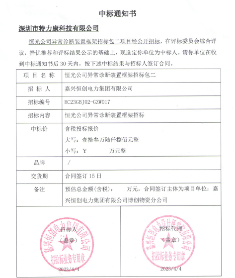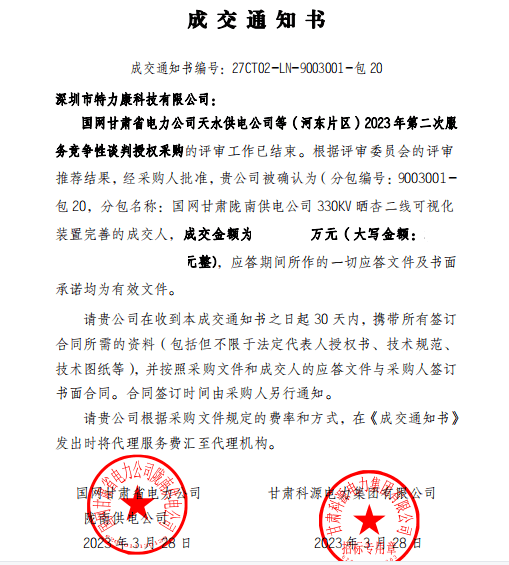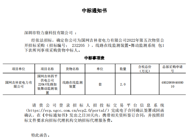 特力康中標國網黑龍江送變電工程公司的2024年度第18次物資類競爭性談判采購項目——慶陽驅鳥器物資框 特力康中標國網甘肅省電力公司省管產業單位2024年第五次物資競爭性談判授權采購項目 中標喜訊:深圳市特力康科技有限公司成功入圍許繼集團綜合能源公司輸電線路視頻在線監測裝置模塊集采項目 中標喜訊:特力康成功中標國網重慶市電力公司渝中一片區項目 特力康成功中標國網天津市電力公司2024年第二次?物?資招標項目 特力康中標國網安徽省電力有限公司蕪湖供電公司2024年3月非物質采購項目 山東電網 “穩塔哨兵”:特力康智能桿塔傾斜監測預警裝置筑牢電力桿塔安全防線 特力康科技輸電線路高清圖像監控裝置,為河南輸電通道筑牢安全屏障 黃土高原護塔穩:特力康傾斜監測裝置為山西電網筑牢根基 黔山冰防線:特力康 “數據 + 圖像” 雙監測守護貴州輸電線路 戈壁林區的 “火情哨兵”:特力康紅外熱成像裝置守護甘肅輸電線路 內蒙電網裝上 “舞動監測眼”:特力康輸電線路防舞動監測系統守護線路安全 浙江電力裝上“氣象哨兵”:特力康裝置守護電網應對臺風暴雨 蜀道巡線不用“爬”:特力康視頻在線監測裝置守護四川輸電鐵塔 風雪中的 “防冰哨兵”:內蒙古電力用特力康監測系統筑牢覆冰防線 雙軸感知護塔穩:山西電力用特力康裝置破解采空區傾斜難題 寧夏配電線路安裝了我司防外破電子化智能警示牌