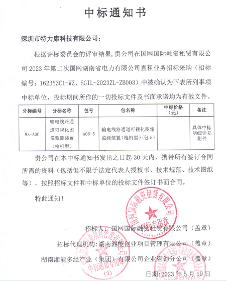 特力康中標2023年第二次國網湖南省電力有限公司直租業務招標采購可視化圖像監測