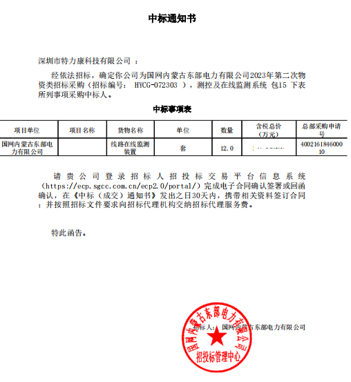 經(jīng)依法招標,確定我司為國網(wǎng)內(nèi)蒙古東部電力有限公司2023年第二次物資類招標采購(招標編號: HYCG -072303 ),測控及在線監(jiān)測系統(tǒng)包15下表所列事項采購中標人。中標通知如下: