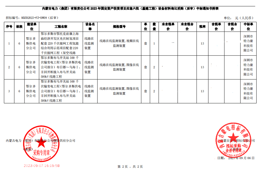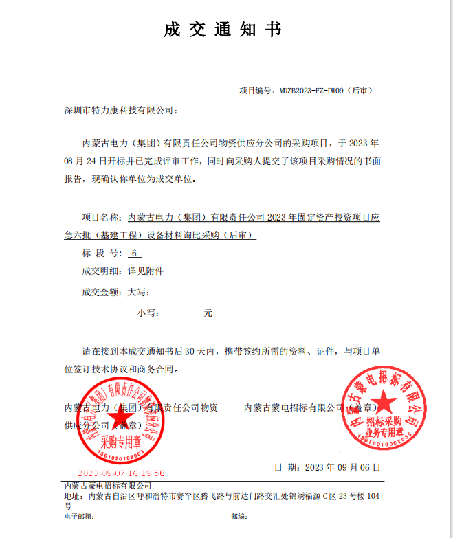 特力康中標內蒙古電力(集團)有限責任公司 2023 年固定資產投資項目應急六批(基建工程)設備材料詢比采購
