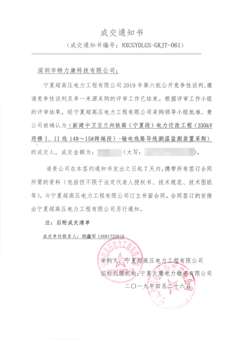 寧夏超高壓局2019年第六批公開競爭性談判電力遷改項(xiàng)目評審工作已結(jié)束,經(jīng)評審委員會(huì)評審,經(jīng)寧夏超高壓局招投標(biāo)領(lǐng)導(dǎo)小組批準(zhǔn),我司被確定為此項(xiàng)目簽約單位現(xiàn)將公告公示。