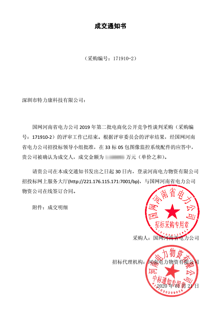 國網(wǎng)河南省電力公司2019年第二批電商化公開競爭性談判采購(采購編號: 171910-2) 談判工作已結(jié)束,經(jīng)評審委員會評審,并報(bào)公司招投標(biāo)工作領(lǐng)導(dǎo)小組批準(zhǔn),我司中標(biāo)國網(wǎng)河南省電力公司2019年第二批電商化公開競爭性談判采購33標(biāo)05包圖像監(jiān)控系統(tǒng)配件及34標(biāo)03包圖像監(jiān)控系統(tǒng)接口板,中標(biāo)通知如下: