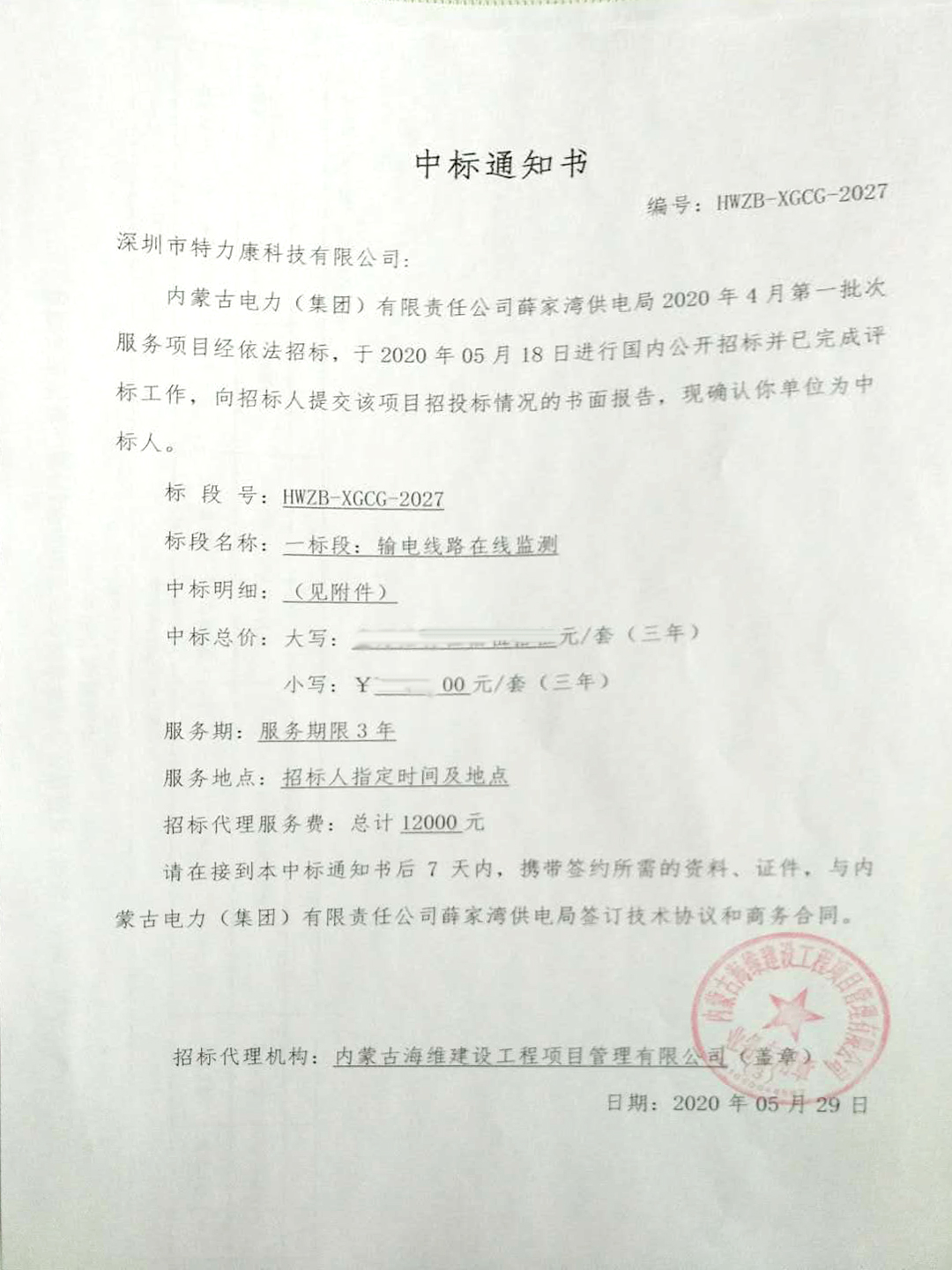 內(nèi)蒙古電力(集團)有限責任公司薛家灣供電局2020年4月第一批次服務(wù)項目(一標段:輸電線路在線監(jiān)測)經(jīng)依法招標,于2020年05月18日進行國內(nèi)公開招標并已完成評標工作,向招標人提交該項目招投標情況的書面報告,現(xiàn)確認我司(深圳市特力康科技有限公司)為中標人。特發(fā)中標通知書,如下: