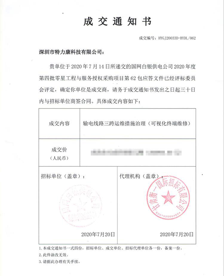 我司于2020年7月14日參加了國網白銀供電公司2020年度第四批零星工程與服務授權采購項目第62包輸電線路三跨運維措施治理(可視化終端維修)的投標工作,所遞交的應答文件經評標委員會評定,確定我司(深圳市特力康科技有限公司)是成交商,具體成交內容如下: