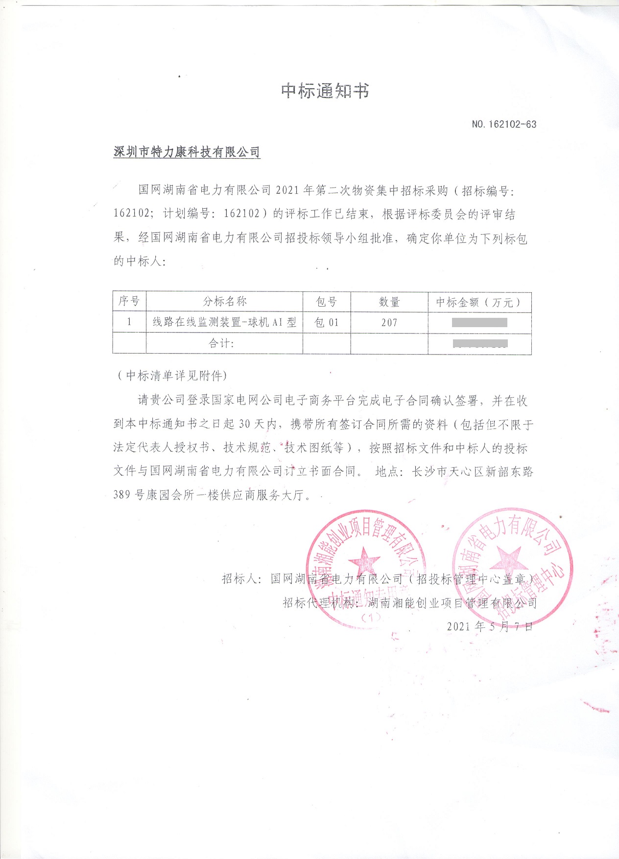 國網湖南省電力有限公司2021年第二次物資集中招標采購(招標編號:162102;計劃編號: 162102) 的評標工作已結束,根據評標委員會的評審結果,經國網湖南省電力有限公司招投標領導小組批準,確定我司為線路在線監測裝置-球機AI型標包的中標人,中標通知如下: