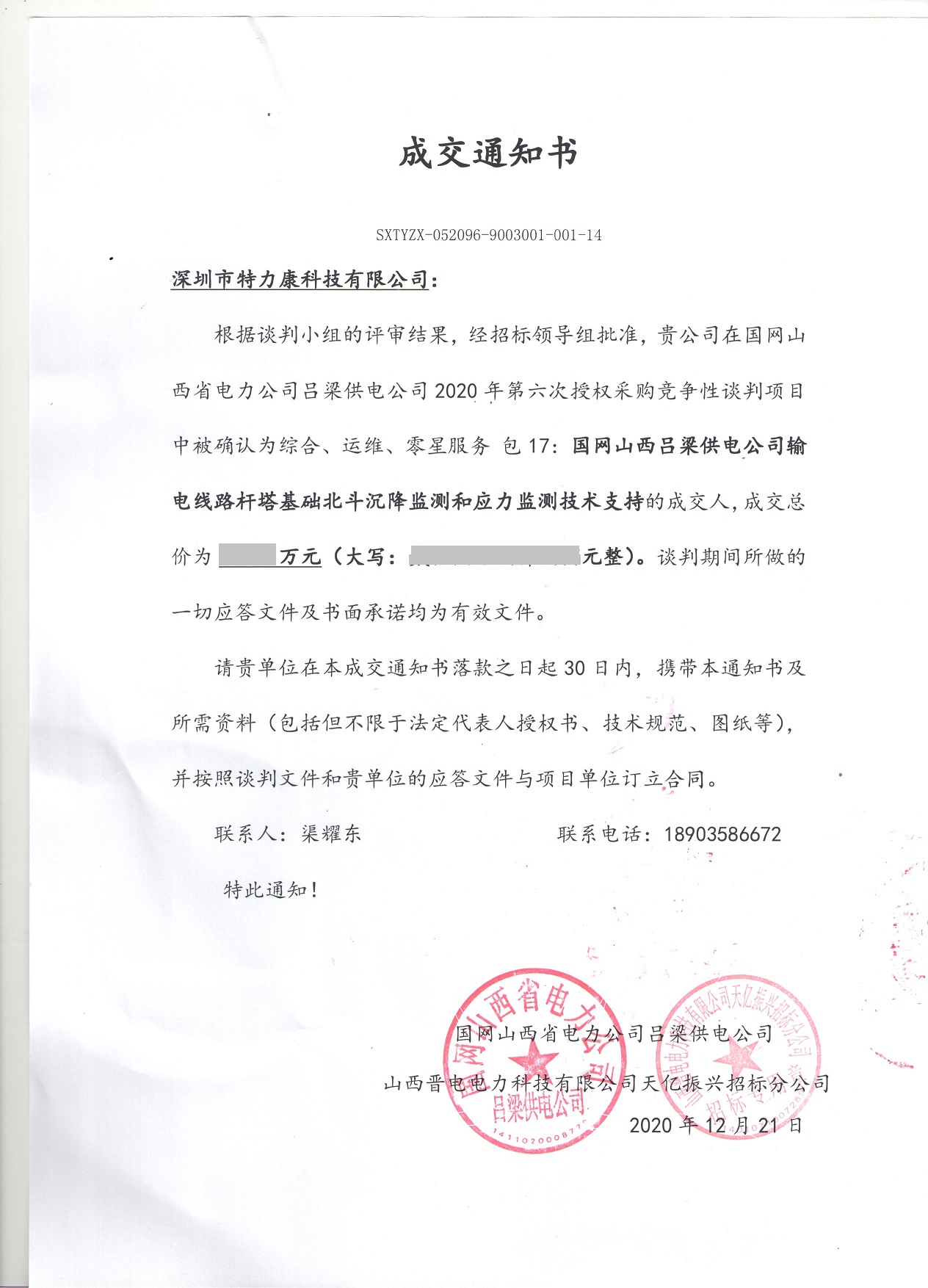 根據(jù)談判小組的評審結(jié)果,經(jīng)招標(biāo)領(lǐng)導(dǎo)組批準(zhǔn),貴公司在國網(wǎng)山西省電力公司呂梁供電公司2020年第六次授權(quán)采購競爭性談判項目中被確認(rèn)為綜合、運維、零星服務(wù)包17:國網(wǎng)山西呂梁供電公司輸電線路桿塔基礎(chǔ)北斗沉降監(jiān)測和應(yīng)力監(jiān)測技術(shù)支持的成交人,成交通知如下:
