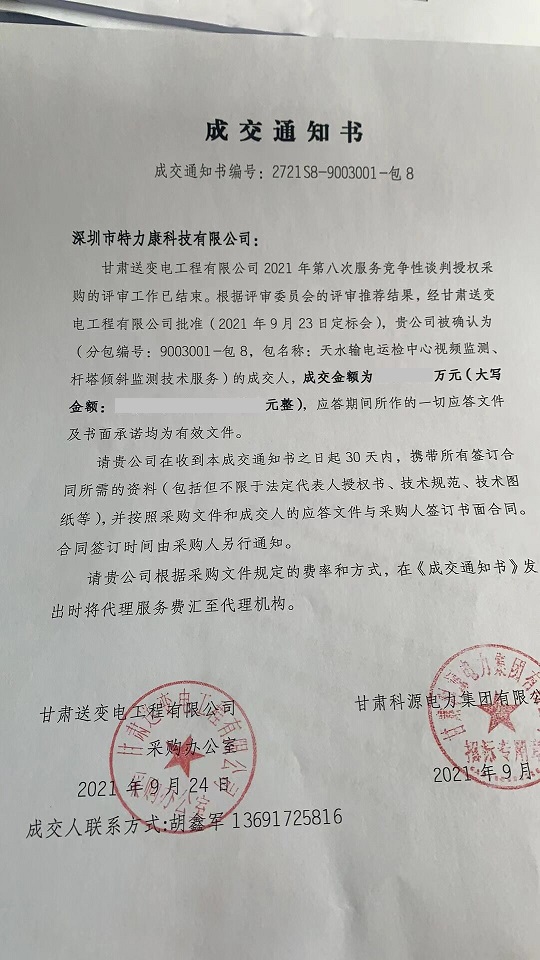 甘肅送變電工程有限公司2021年第八次服務(wù)競爭性談判授權(quán)采購的評審工作已結(jié)束。根據(jù)評審委員會的評審?fù)扑]結(jié)果,經(jīng)甘肅送變電工程有限公司批準(zhǔn)(2021 年9月23日定標(biāo)會),貴公司被確認(rèn)為(分包編號: 9003001-包8, 包名稱:天水輸電運檢中心視頻監(jiān)測、桿塔傾斜監(jiān)測技術(shù)服務(wù))的成交人,中標(biāo)通知如下: