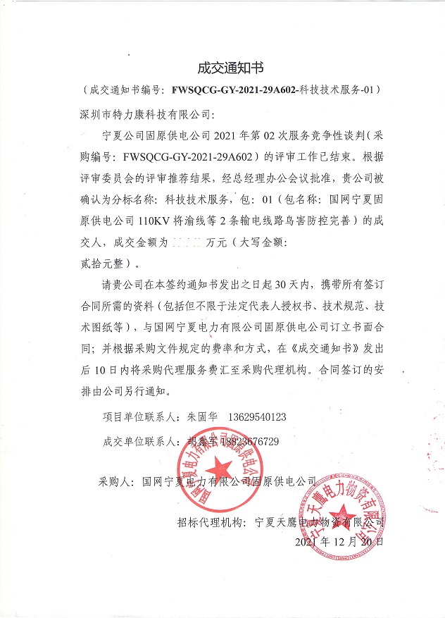 寧夏公司固原供電公司2021年第02次服務(wù)競(jìng)爭(zhēng)性談判(采購(gòu)編號(hào): FWSQCG-GY-2021-29A602) 的評(píng)審工作已結(jié)束。根據(jù)評(píng)審委員會(huì)的評(píng)審?fù)扑]結(jié)果,經(jīng)總經(jīng)理辦公會(huì)議批準(zhǔn),貴公司被確認(rèn)為分標(biāo)名稱(chēng):科技技術(shù)服務(wù),包: 01 (包名稱(chēng):國(guó)網(wǎng)寧夏固原供電公司110KV將渝線等2條輸電線路鳥(niǎo)害防控完善)的成交人,成交通知如下:
