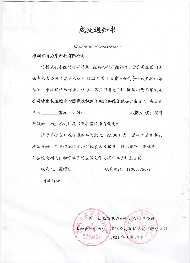 根據談判小組的評審結果,經招標領導組批準,貴公司在國網山西省電力公司呂梁供電公司2022年第1次非物資競爭性談判授權采購項目中被確認為綜合、運維,零星服務包14:國網山西呂梁供電公司榆變電運檢中心圖像及視頻監控設備維保服務的成交人,中標公告如下: