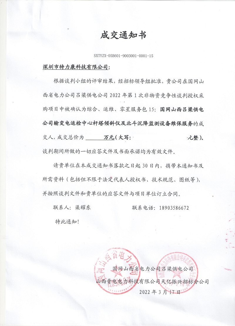 根據談判小組的評審結果,經招標領導組批準,我司在國網山西省電力公司呂梁供電公司2022年第1次非物資競爭性談判授權采購項目中被確認為綜合、運維、零星服務包15:國網山西呂梁供電公司輸變電運檢中心桿塔傾斜儀北斗沉降監測設備維保服務的成交人,成交通知如下: